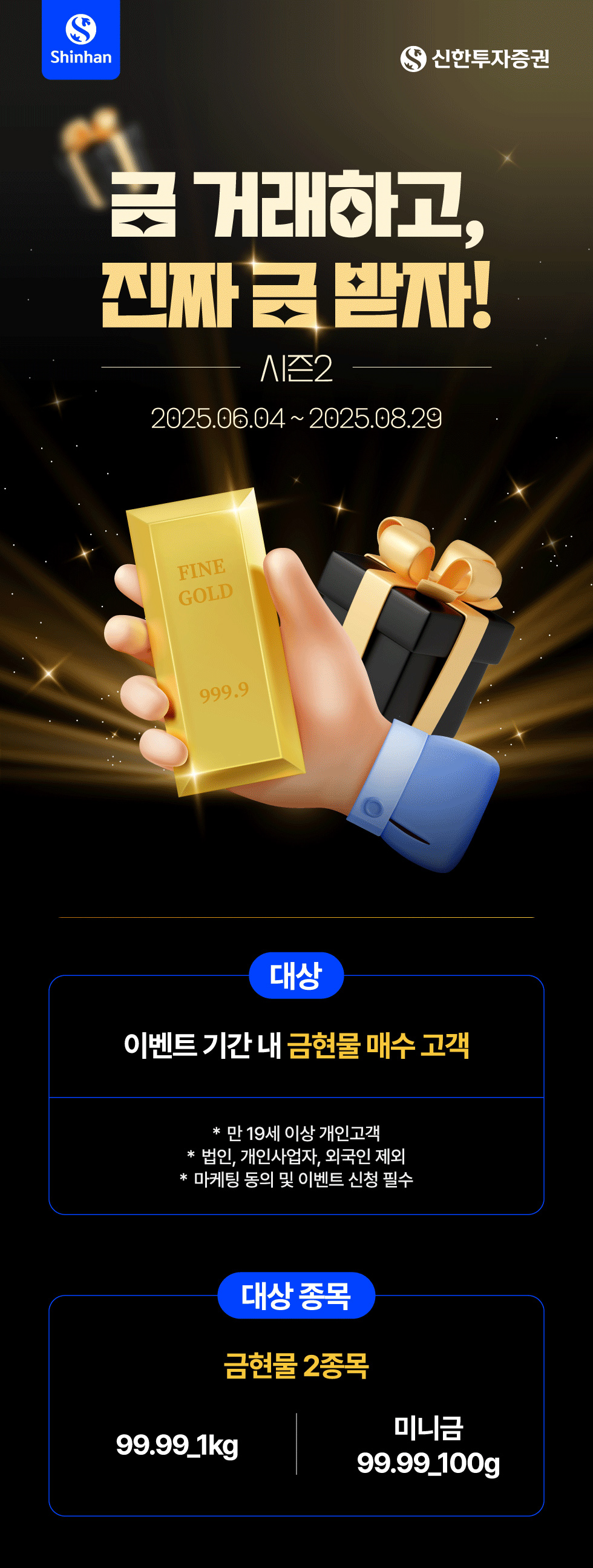 해당 이벤트는 신한투자증권에 금현물 거래가 가능한 계좌를 보유한 고객이 참여 가능하며, 이벤트 기간 내 신규 계좌개설 후 금거래 신청 및 기존 금거래 신청 고객 모두 대상에 포함합니다.
