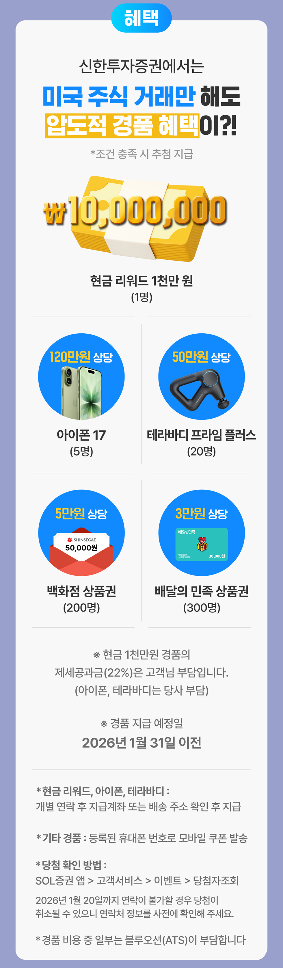 - 현금 리워드 경품 및 아이폰, 테라바디 경품은 추첨 후 개별 연락을 통해 경품 지급 계좌 혹은 배송 주소 확인 후 2026년 1월 31일 이전에 지급할 예정이며, 모바일 경품은 고객님 계좌 정보에 등록되어 있는 휴대폰 번호로 발송됩니다.