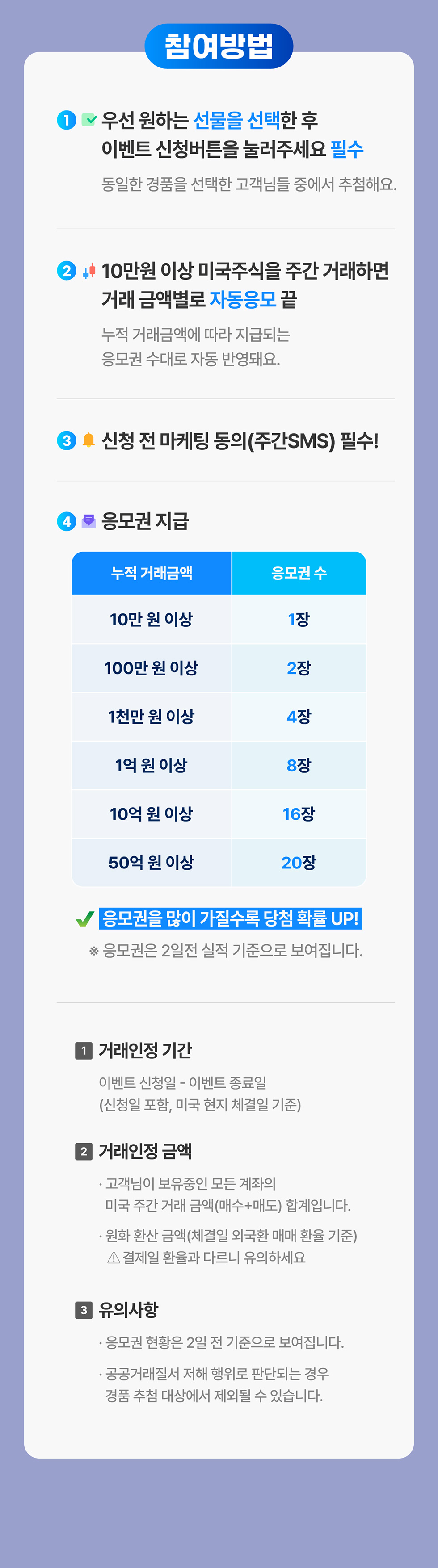 - 거래 실적 인정 기간은 이벤트 신청일 ~ 이벤트 종료일까지 입니다. (신청일 거래 금액 포함, 미국 현지 영업일 체결 기준)